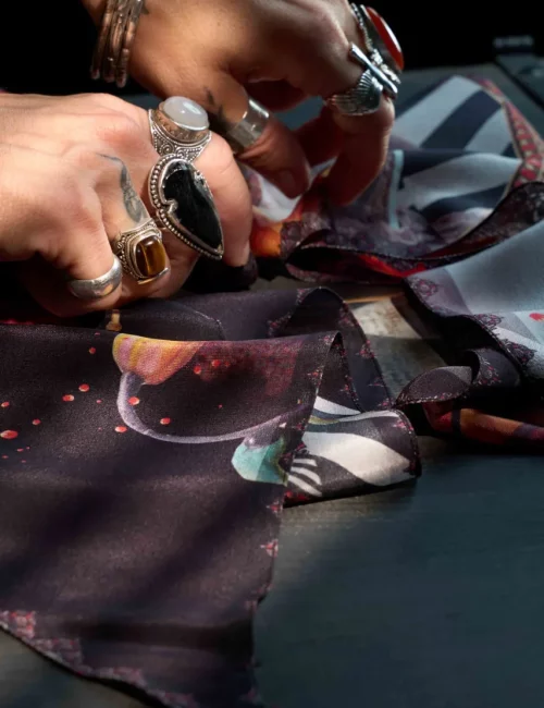 It is more than a scarf, it is the story of my life, my mood, my hopes and inspirations. I believe that each scarf worn, has the combined energy of my creations and that of the person wearing it. Wearing silk is a ritual, a protection, a gesture that keeps you feeling beautiful and vibrant. The combination of high quality silk and the limited editions keeps the art work exclusive and special. The momentum and energy of music moves me, goes through the core of my essence. Exhilarated when I see good musicians, the lights on stage and my scarves bouncing to the beat. Doesn’t get much better than that for me.
