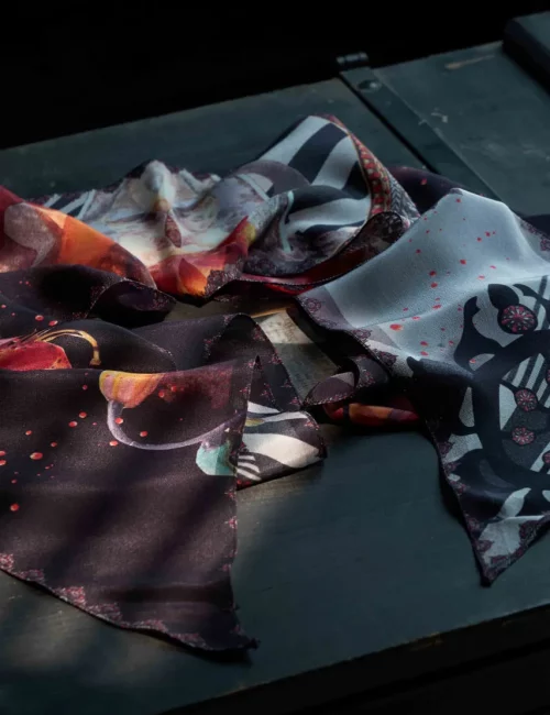 Dadadésir scarves stand out with their artistic, symbolic designs, avoiding the repetitive patterns typical of mass production. Each piece explores unique themes—animals, cosmic worlds, underwater scenes, visual arts, and architecture—imbued with meaningful symbols that capture a timeless, creative spirit. These scarves tell stories, turning each one into a distinct work of art.